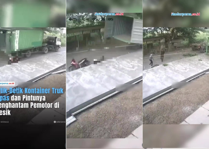 Tak lama kemudian, kontainer terlepas dari truk dan terguling ke arah pengendara motor, menyebabkan korban terjatuh dan terseret.